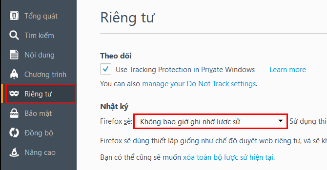 Nhấn tab Privacy (Riêng tư) -> chọn hộp Firefox will (Firefox sẽ) dưới phần History (Nhật ký) -> chọn Never remember history (Không bao giờ ghi nhớ lược sử). Khởi động lại Firefox để áp dụng thay đổi.
