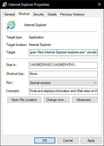 Giọng như Chrome, bạn phải thêm lệnh để kích hoạt mặc định InPrivate Browsing với Internet Explorer.