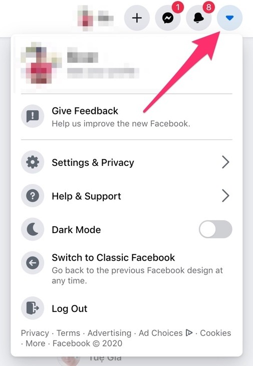 Bước 1: Mở trình duyệt web trên máy tính và truy cập vào địa chỉ Facebook.com, sau đó đăng nhập, rồi bấm nút hình mũi tên hướng xuống ở phía trên góc phải.