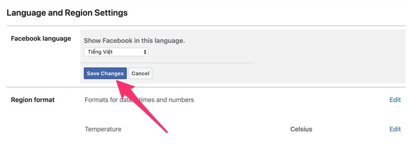 Bước 4: Bấm nút Edit nằm bên phải mục Facebook language, sau đó chọn ngôn ngữ bạn muốn đổi sang, chẳng hạn tiếng Việt.