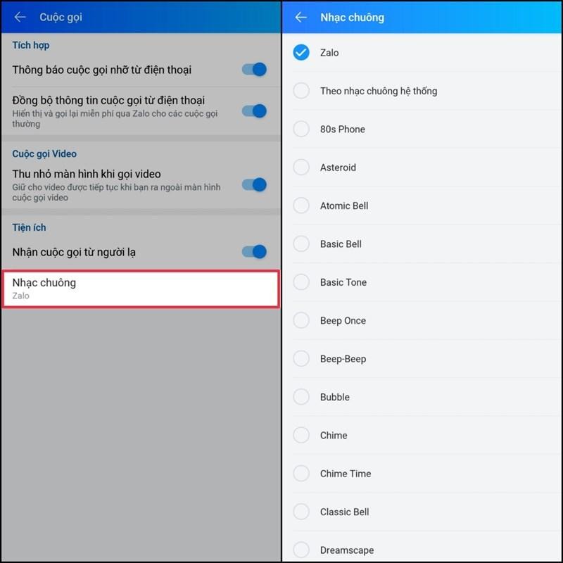 Mới đây, Zalo đã cho phép bạn đổi âm thanh nhạc chuông video gọi tới, thay vì chỉ 1 kiểu âm thanh gọi video như trước đây. Đây là tính năng mới khi bạn cập nhật Zalo trên điện thoại. Người dùng sẽ được lựa chọn nhiều kiểu âm thanh nhạc chuông khác nhau, hoặc có thể sử dụng ngay chính nhạc chuông điện thoại để làm nhạc chuông gọi video trên Zalo đều được. Như vậy sau nhiều bản cập nhật thì giờ đây Zalo cũng đã cho phép bạn thay đổi chuông video gọi đến tương tự như tính năng đổi nhạc chuông trên Messenger .