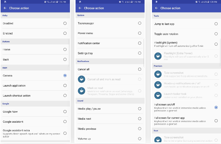 Trong phần “Choose Action” sẽ xuất hiện một danh sách các chức năng có thể gán cho Bixby để lựa chọn kể cả đối với người dùng miễn phí như: thay thế phím nguồn, Home, Back, mở nhanh ứng dụng chụp ảnh ngay trên màn hình khóa.