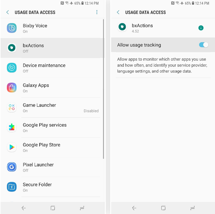 Khi tùy chọn “Get foreground app” được kích hoạt, hệ thống sẽ đưa người dùng tới mục “Usage Data Access” nằm trong “Setting”. Tại đây hãy tìm phần bxAction và gạt để kích hoạt quyền theo dõi quá trình sử dụng “Allow usage tracking”.