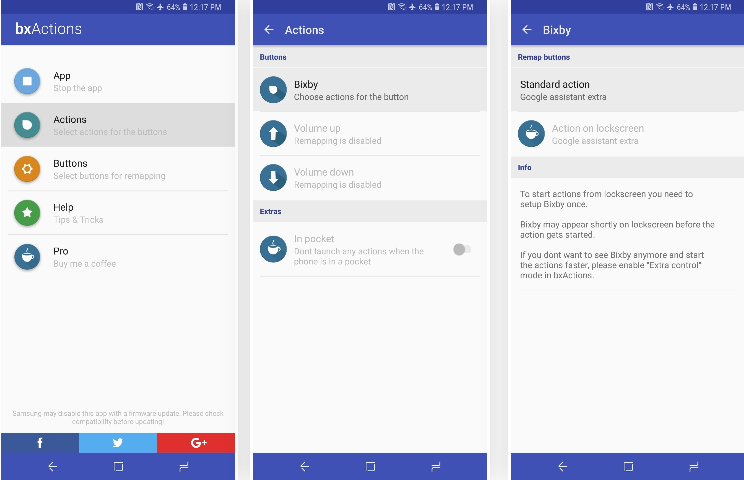 Theo phản ánh từ người dùng trên Play Store, bxActions hiện tại đang hoạt động rất tốt trên S9/S9+. Tuy nhiên các bản cập nhật trong thời gian tới của Samsung có thể sẽ vô hiệu hóa và nhà phát triển sẽ cần thời gian để tinh chỉnh lại ứng dụng.