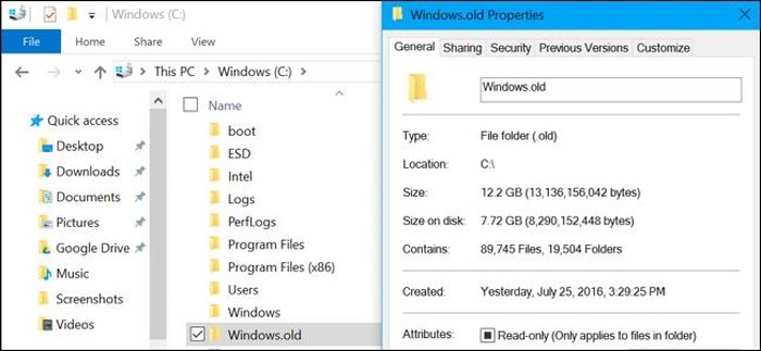 Khi bạn nâng cấp lên một bản build mới, Windows sẽ tạo ra thư mục Windows.old. Đây là thư mục chứa các file hệ thống từ bản Windows "cũ" của bạn. Chúng cho phép bạn "quay về" bản build trước đó của Windows 10 nếu bạn gặp vấn đề với bản build mới.