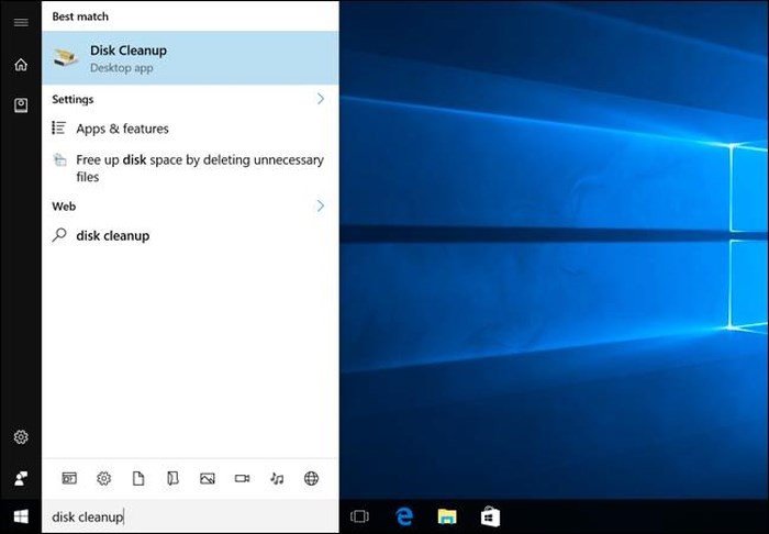 Bạn có thể sử dụng công cụ Disk Cleanup để xóa những thứ bạn muốn. Để khởi chạy nó, bạn mở trình đơn đơn Start, tìm kiếm với từ khóa Disk Cleanup, và nhấn Enter.