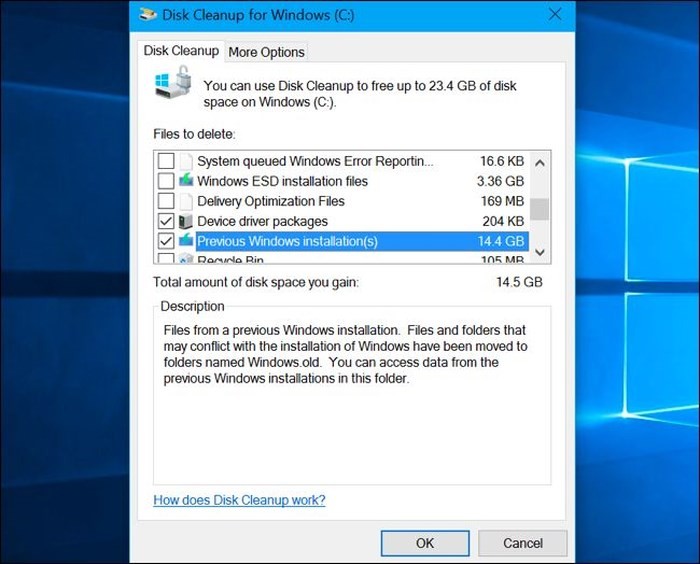 Nhấn nút OK sau khi bạn đã chọn những gì mình muốn xóa. Disk Cleanup sẽ xóa các file của bộ cài đặt Windows trước đó và giải phóng không gian trên ổ đĩa của bạn.