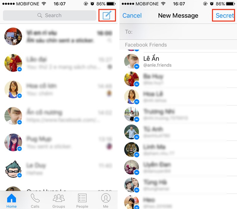 Đầu tiên, bạn cần mở ứng dụng Facebook Messenger và nhấn nút Compose New Message ở phía trên góc phải, chọn Secret ở trên cùng bên phải.