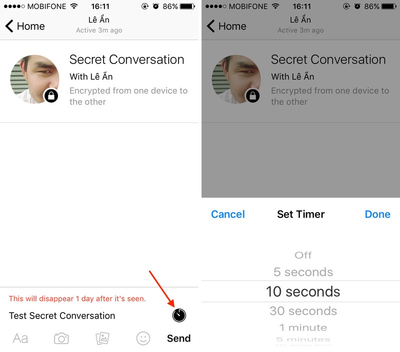 Khi bạn đã chọn người nhận xong, hãy nhập nội dung tin nhắn. Mặc định, tin nhắn sẽ không được thiết lập tự huỷ. Để gửi một tin nhắn tự huỷ, bạn cần chạm vào nút đồng hồ hẹn giờ nhỏ nằm bên trên biểu tượng Like hay nút Send. Chọn thời gian tin nhắn tồn tại, và sau đó nhấn nút Send để gửi nó. Bạn có thể đặt thời gian tự huỷ từ 5 giây cho đến 1 ngày.