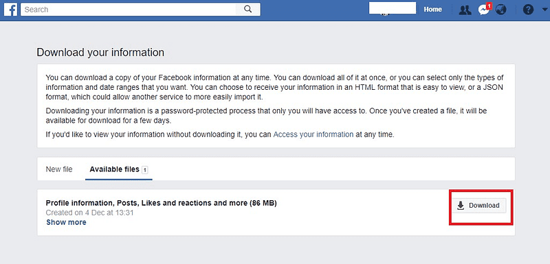 Bước 4: Bấm vào lựa chọn Download your information, tiếp đến chọn Messages sau đó bấm vào Create file.