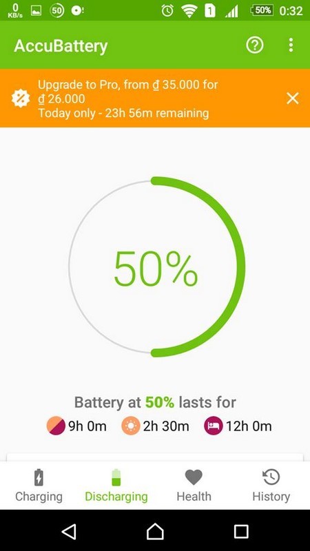 Giao diện chính của AccuBattery sẽ hiển thị thông tin về mức độ pin hiện tại trên smartphone cũng như ước tính khoảng thời gian sử dụng và thời gian chờ của smartphone với mức pin này.
