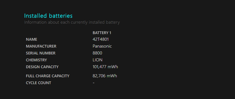 Báo cáo cung cấp cho bạn các thông tin chi tiết về pin bao gồm tên (name), nhà sản xuất (manufacturer), số serial (serial number), loại pin (chemistry), chu kỳ đã qua sử dụng (cycle count), công suất được thiết kế bởi nhà sản xuất (design capacity), công suất pin có thể đạt được trong lần sạc kế tiếp (full charge capacity).