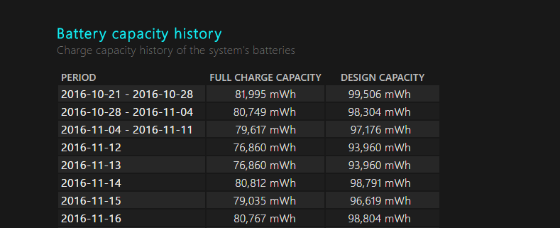 So sánh công suất pin được nạp đầy khi sạc (full charge capacity) với công suất được thiết kế (design capacity) qua từng khoảng thời gian tại mục Battery capacity history. Full charge capacity và design capacity là hai thông số giúp bạn theo dõi tình trạng sức khoẻ của pin và bạn nên xem xét thay thế pin mới khi chỉ số full charge capacity quá thấp.