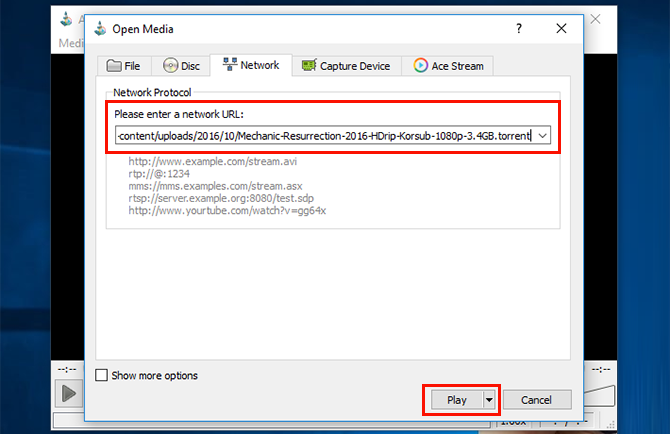 Copy đường link torrent > Mở chương trình Ace Player HD chọn Media > Open Network Stream… > Dán đường link torrent vừa copy vào khung "Please enter a network URL" > Nhấn Play