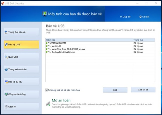 Khi cắm USB vào máy tính, phần mềm sẽ tự động quét toàn bộ dữ liệu, xóa các tập tin độc hại hoặc chuyển sang mục Cách ly. Ngoài ra, người dùng cũng có thể chủ động thực hiện việc này thông qua mục Quét USB.