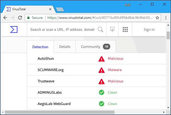 Trong một số trường hợp, kết quả quét sẽ đồng nhất. Trong một vài trường hợp khác, chỉ một số công cụ antivirus phát hiện file có vấn đề. Lý do là bởi vì một vài công cụ antivirus cập nhật dữ liệu nhận diện malware trước những công cụ khác. Bạn có thể cuộn xuống để xem những công cụ antivirus nào phát hiện file có vấn đề, xem thông tin chi tiết về file, và xem các bình luận của cộng đồng về việc liệu một địa chỉ URL là an toàn hay không.