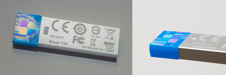 USB chứa bộ cài đặt Windows 10 sẽ có các hiệu ứng màu sắc và 3D rực rỡkhi thiết bị USB bị nghiêng. Hình ba chiều (Hologram) này được nhúng trong thành phần đúc nhựa của USB. Nó không phải là một nhãn dán. Nên nếu bạn có thể bóc nhãn phần hiệu ứng này, khả năng cao đó là phần mềm giả mạo.