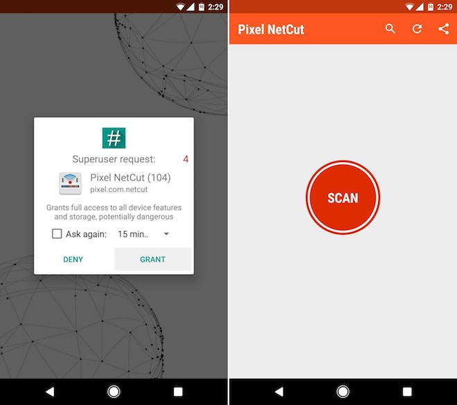 Sau khi quá trình cài đặt hoàn tất, bạn hãy mở ứng dụng từ biểu tượng trên màn hình thiết bị. Khi thấy màn hình yêu cầu cấp quyền Superuser, bạn chọn Grant. Ngay lập tức, bạn sẽ được đưa đến trình đơn chính của Pixel NetCut. Để thấy tất cả các thiết bị đã kết nối vào mạng WiFi, bạn nhấn nút Scan. Lưu ý: Thiết bị Android của bạn phải được kết nối với mạng cần phân tích trước khi tiến hành quét.