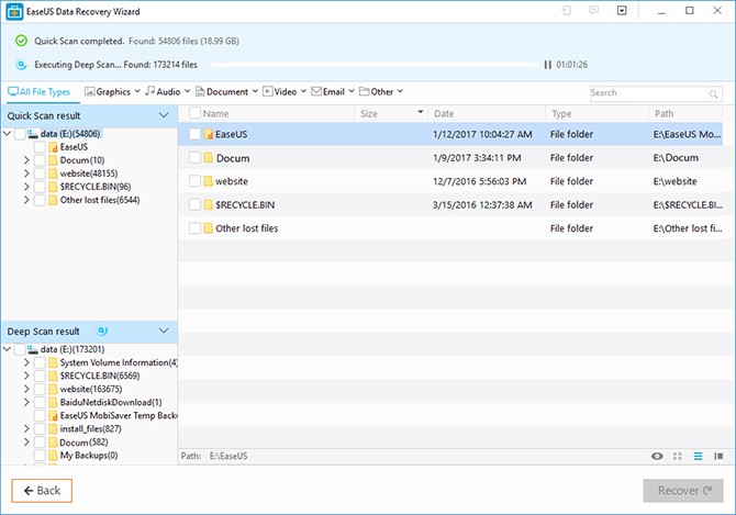 Giao diện kết quả quét sẽ được chia làm 3 phần. Ở phía bên trái là danh sách Directory Tree,cung cấp cho bạn 3 cách thức (theo Path, Type và Time) để nhanh chóng lọc file. Cửa sổ ở giữa sẽ hiển thị tất cả file và thư mục trong thư mục đựa lựa chọn ở cửa sổ bên trái với nhiều thông tin hơn (Date & Type). Cửa sổ ở phía bên phải sẽ hiển thị một hình thu nhỏ và thông tin cho file được lựa chọn ở cửa sổ giữa. Nó cung cấp tùy chọn Preview để xem trước file trong chương trình.