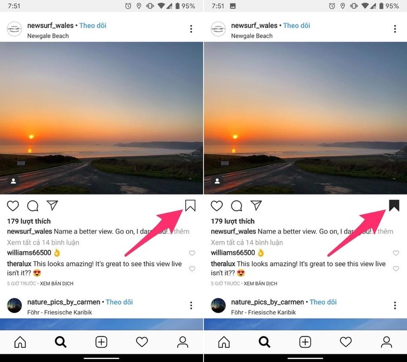 Trường hợp bạn bắt gặp bức ảnh mình yêu thích trong khi đang lướt Instagram trên di động, bạn chỉ cần bookmark (lưu dấu) nó để dễ tìm lại nó. Để làm vậy, bạn chỉ cần bấm nút bookmark ở phía dưới góc phải của bức ảnh.