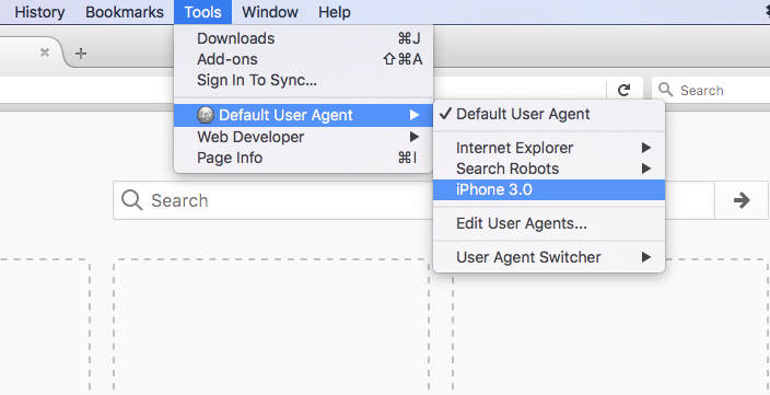 Bước 2: Từ thanh Menu, bạn chọn Tools > Default User Agent và chọn iPhone 3.0. Thao tác này sẽ đổi User Agent của trình duyệt thành iPhone 3.0.