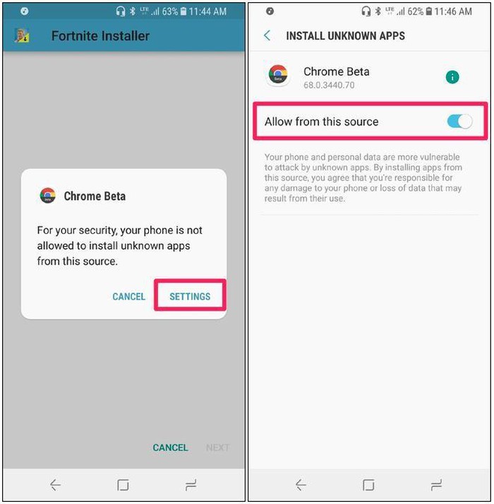 Từ đây, quá trình tải sẽ rắc rối hơn một chút tùy theo phiên bản Android bạn đang dùng. Nếu cửa sổ cảnh báo hiện ra, bấm vào nút Settings. Nó sẽ dẫn bạn đến trình đơn để cho phép ứng dụng cài đặt từ nguồn chưa rõ (sideload). Với Android 8.0 Oreo trở lên, chỉ cần gạt công tắc ở dòng “Allow from this source” là xong.