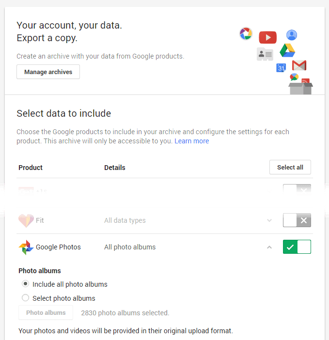 Ở đây, bạn có thể chọn những dữ liệu nào bạn muốn nén và tải về. Mặc định, mọi dữ liệu đều sẽ được chọn. Hãy tiếp tục bằng cách nhấn nút Select none và sau đó chuyển công tắc tại mục Google Photos sang bên phải. Bạn có thể nhấp vào nút mũi tên quay xuống và chọn Select photo albums nếu bạn muốn chọn từng album riêng lẻ.