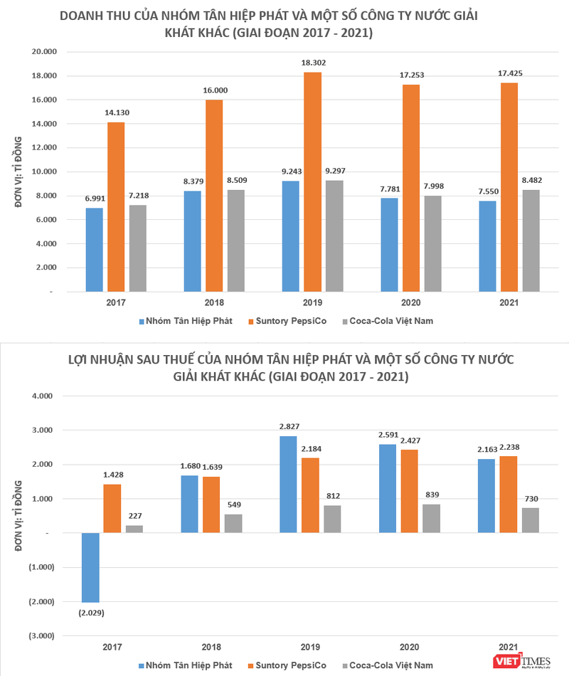 Theo tính toán của VietTimes, năm 2021, với 100 đồng doanh thu, Tân Hiệp Phát thu về tới 28 đồng lợi nhuận, thì Suntory PepsiCo Việt Nam hay Coca-Cola Việt Nam chỉ thu về từ 8-12 đồng lợi nhuận.