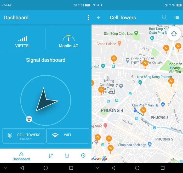 OpenSignal sẽ hiển thị vị trí trạm thu phát sóng di động mà điện thoại đang kết nối. Ảnh: MINH HOÀNG