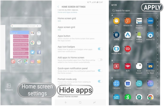 Tuy nhiên, bạn có thể ẩn bớt các ứng dụng không cần thiết này khỏi màn hình để đỡ ngứa mắt. Đầu tiên, bạn hãy nhấn im tại một vùng trống trên màn hình chính, chọn Home screen settings > Hide apps, đánh dấu vào các ứng dụng cần ẩn rồi nhấn Apply. Bất cứ khi nào bạn muốn đưa ứng dụng trở lại, hãy thực hiện tương tự các bước trên và bỏ ẩn.