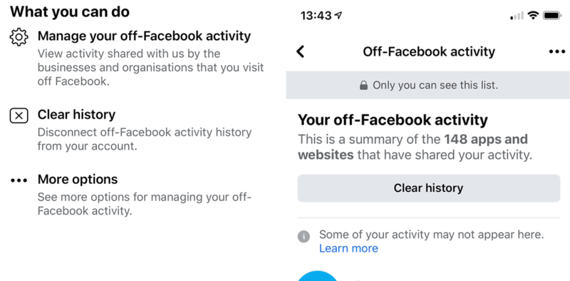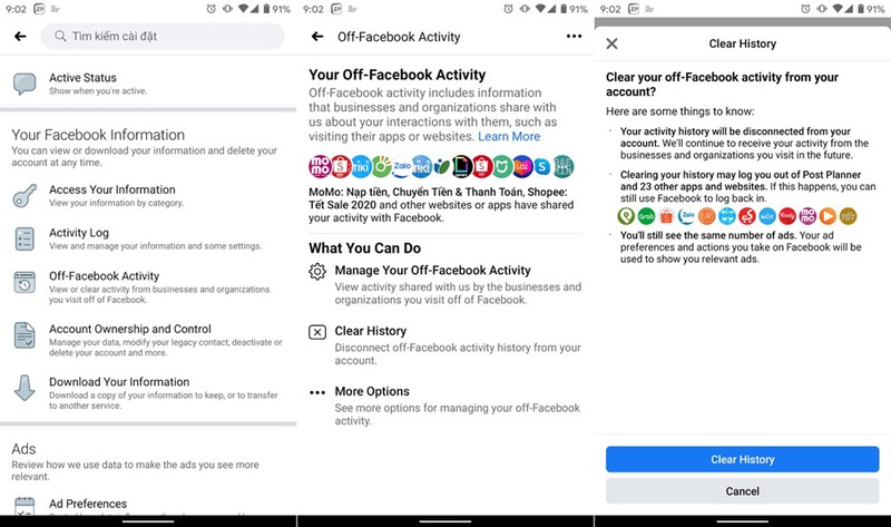 Để xóa lịch sử hoạt động bên ngoài Facebook, bạn chỉ cần làm theo các bước sau: