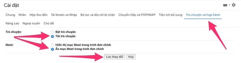 Bạn có thể bật lại khung chat Hangouts và khung Google Meet bất kỳ lúc nào bằng cách lặp lại các thao tác kể trên, sau đó chọn tùy chọn Chat On (Bật trò chuyện) đối với khung chat Hangouts và chọn tùy chọn Show the Meet section in the main menu (Hiển thị mục Meet trong trình đơn chính) đối với khung Google Meet. Hoàn tất, bạn bấm nút Save changes (Lưu thay đổi) để lưu lại các thay đổi.