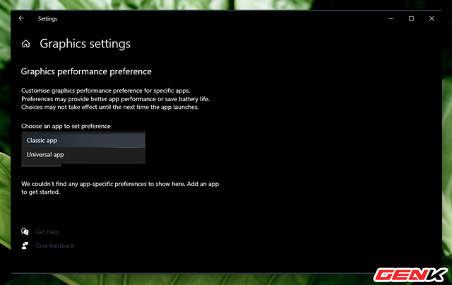 Bước 3: Trong phần này, Windows 10 cung cấp cho người dùng 02 lựa chọn ở mục "Choose an app to set preference" là "Classic apps" (là những ứng dụng cái bằng cách thông thường) và "Universal app" là những ứng dụng cài từ Microsoft Store hay còn được gọi là ứng dụng UWP.