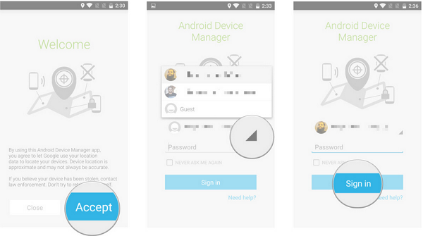 Sau khi cài đặt, bạn sẽ phải đăng nhập ADM từ tài khoản Google của mình. Nếu cùng một lúc dùng nhiều tài khoản khác nhau trên điện thoại của mình, bạn kích chọn 1 tài khoản muốn liên kết với điện thoại từ trình đơn thả xuống. Mở Device Manager, nhấn chọn vào nút Accept để đăng nhập vào tài khoản Google của mình, lựa chọn tài khoản Google và nhập mật khẩu và nhấn vào nút màu xanh Sign in.