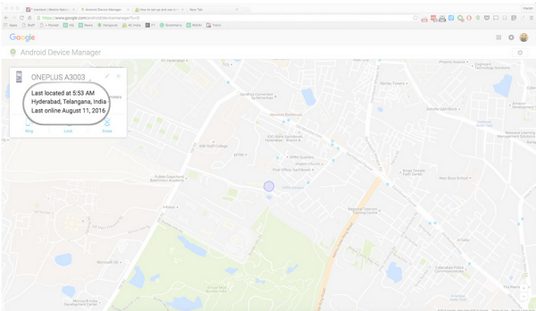Sau khi đăng nhập thành công vào DMA, bạn sẽ thấy một bản đồ vị trí hiện tại của mình, cùng với 03 lựa chọn cho chiếc smartphone của mình như: Đổ chuông, Khóa và Xóa toàn bộ dữ liệu. Nếu đăng nhập bằng nhiều thiết bị khác nhau, bạn hãy chọn một thiết bị cụ thể bằng cách nhấp vào danh sách thả xuống ở dưới cùng màn hình. Mở Device Manager, tiếp đến chọn điện thoại của bạn từ danh sách thả xuống và kiểm tra xem liệu điện thoại của bạn đã kết nối với Device Manager Android.
