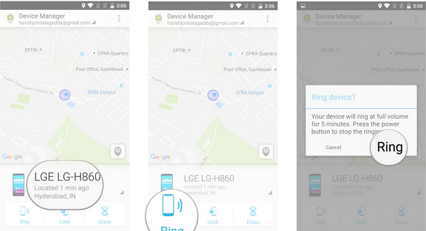 Khi đăng nhập vào ADM để xác định vị trí của điện thoại, bạn có ba tùy chọn. Đầu tiên là Ring, điện thoại của bạn sẽ đổ chuông liên tục ở mức âm lượng lớn nhất trong năm phút ngay cả khi bạn tắt chuông gọi đến. Một khi bạn tìm thấy điện thoại của mình, bạn có thể nhấn nút nguồn để ngăn chặn tiếng chuông. Để xác định vị trí của điện thoại, bạn vào Device Manager Android→Ring→nhấn chọn Ring trên cửa sổ Pop-up.