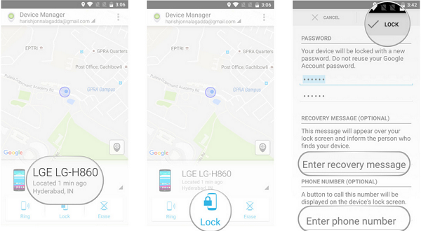 Có một tùy chọn Lock (khóa) cho phép bạn thiết lập một mật khẩu mới để mở khóa điện thoại. Bạn cũng có thể hiển thị một tin nhắn qua màn hình khóa và thêm một nút để gọi lại số của bạn để bất cứ ai mà đi qua điện thoại của bạn có thể dễ dàng liên lạc với bạn. Để xác định vị trí điện thoại, bạn vào Device Manager Android, nhấn chọn Lock, thiết lập một mật khẩu và nhập tin nhắn và số điện thoại để hiển thị trên màn hình khóa.