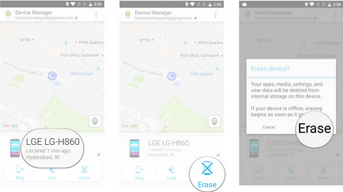 Nếu không còn cơ hội lấy lại chiếc điện thoại đã mất, bạn hãy tiến hành xóa dữ liệu từ xa. Chọn tùy chọn Erase sẽ xóa tất cả các dữ liệu trên điện thoại của bạn. Dịch vụ này cũng xóa dữ liệu từ thẻ SD kết nối. Ngay cả khi điện thoại của bạn đang ở chế độ tắt nguồn, bạn vẫn có thể gửi lệnh Erase. Để xác định vị trí của chiếc điện thoại bạn vào DMA, nhấn chọn vào Erase và xác nhận xoá dữ liệu bằng cách nhấn Erase trên cửa sổ pop-up.