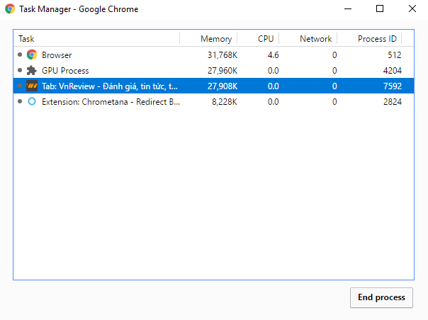 Mở Chrome và nhấn đồng thời các phím Shift + Esc để mở Chrome Task Manager. Bạn sẽ thấy danh sách tất cả các thẻ đang mở, và tất cả các ứng dụng mở rộng bạn đã cài đặt vào trình duyệt. Bạn có thể sắp xếp chúng theo mức chiếm dụng CPU từ cao đến thấp. Sau đó, bạn chọn thẻ chiếm dụng nhiều CPU nhất và nhấn nút End process để đóng nó.