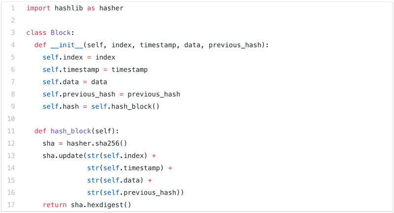 Đầu tiên, hãy định nghĩa block trong bài viết là thế nào. Trong blockchain, mỗi block được lưu với một dấu mốc thời gian và một chỉ số (index – cái này là tùy chọn). Trong SnakeCoin, chúng ta sẽ lưu cả hai. Để đảm bảo sự thống nhất trong toàn bộ blockchain, mỗi block sẽ có một hàm băm (hash) tự nhận dạng. Giống như Bitcoin, hàm băm của mỗi block sẽ là một mật mã của chỉ số (index), dấu mốc thời gian, dữ liệu và băm của băm block trước. Dữ liệu sẽ là bất kỳ cái gì bạn muốn.
