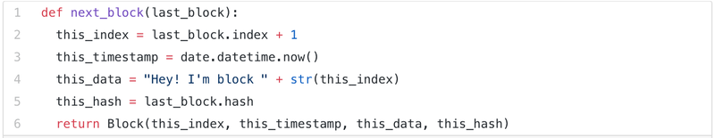 Như vậy, chúng ta đã có thể tạo ra một block gốc, chúng ta cần một hàm khác để tạo ra các block tiếp theo. Hàm này sẽ lấy block liền trước trong chuỗi làm tham số, tạo ra dữ liệu cho block sắp được tạo ra, và lại tiếp tục tạo ra block mới với dữ liệu phù hợp. Khi các block mới đã có thông tin hàm băm của các block trước, tính thống nhất, nguyên vẹn của blockchain sẽ tăng lên. Nếu không, rất dễ cho một kẻ bên ngoài thay đổi quá khứ và thay thế chuỗi của chúng ta với một cái hoàn toàn mới của họ.