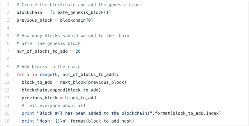 Đó là phần lớn mảng công việc khó khăn. Bây giờ, chúng ta đã có thể tạo ra blockchain! Trong trường hợp này, blockchain chính là một danh sách Python đơn giản. Phần tử đầu tiên chính là block đầu tiên. Và tất nhiên, chúng ta cần thêm các block kế tiếp. Bởi vì SnakeCoin là blockchain ngắn gọn nhất, chúng ta sẽ chỉ thêm 20 block mới. Chúng ta có thể làm điều này theo một vòng lặp.