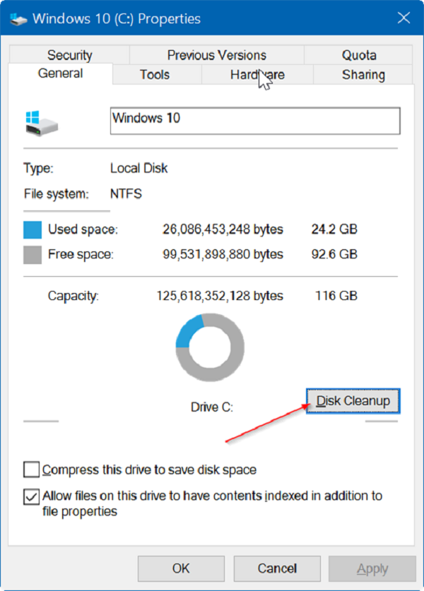 Bước 2: Dưới thẻ General của hộp thoại Properties, nhấn nút Disk Cleanup để công cụ này tính toán lượng không gian trống bạn có thể giải phóng bằng cách xóa các file không cần thiết.