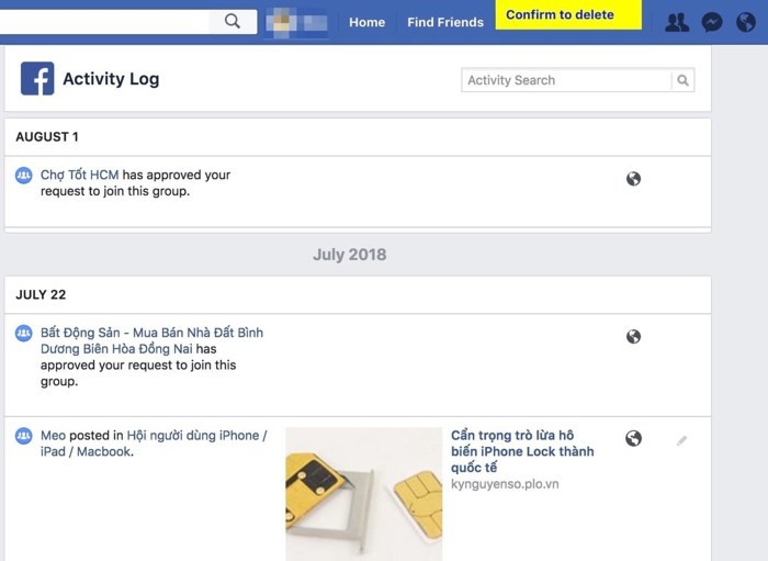 Social Book Post Manager có thể liệt kê toàn bộ bài viết theo từng mốc thời gian cụ thể, tuy nhiên, nếu số lượng bài viết quá nhiều, thời gian quét dữ liệu sẽ mất từ vài giờ đến một ngày hoặc lâu hơn. Để bắt đầu, bạn hãy truy cập vào trang Facebook cá nhân và chọn Activity Log (nhật kí hoạt động).