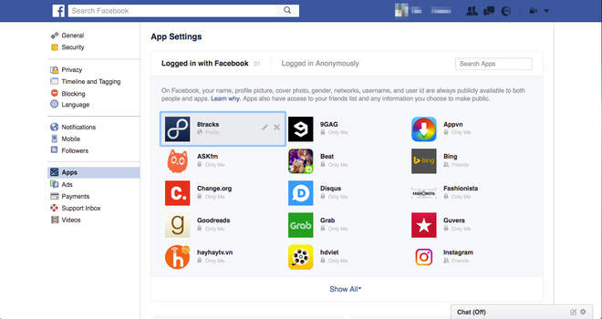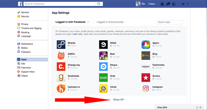 10. Danh sách những ứng dụng theo dõi bạn trên Facebook sẽ khá là "sốc". Click vào phần "show all" - "hiển thị tất cả" để thấy được toàn bộ danh sách này.
