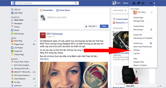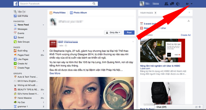 1. Trước tiên là cách "giải quyết" việc theo dõi quảng cáo: Click vào mũi tên đi xuống ở phía trên bên phải trangFacebook