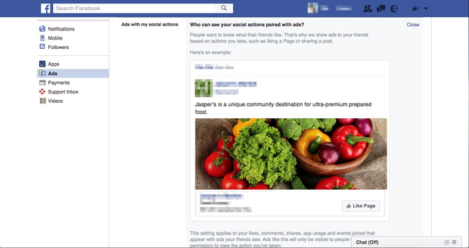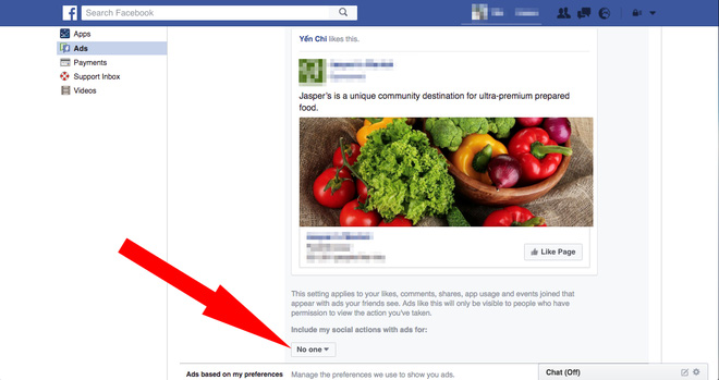 5. Ở đây, người dùng sẽ biết được tài khoản Facebook của mình đã được sử dụng như thế nào tại các quảng cáo. Ví dụ như đối với tài khoản này, bạn bè của tôi sẽ nhìn thấy một quảng cáo của Jasper's Market bởi tôi đã từng ấn Like cho trang Facebook của công ty này trước đó