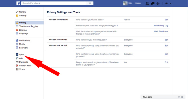 7. Tiếp theo là đối với những ứng dụng, ấn vào biểu tượng "cái khoá" ở phía trên bên phải của trang Facebook