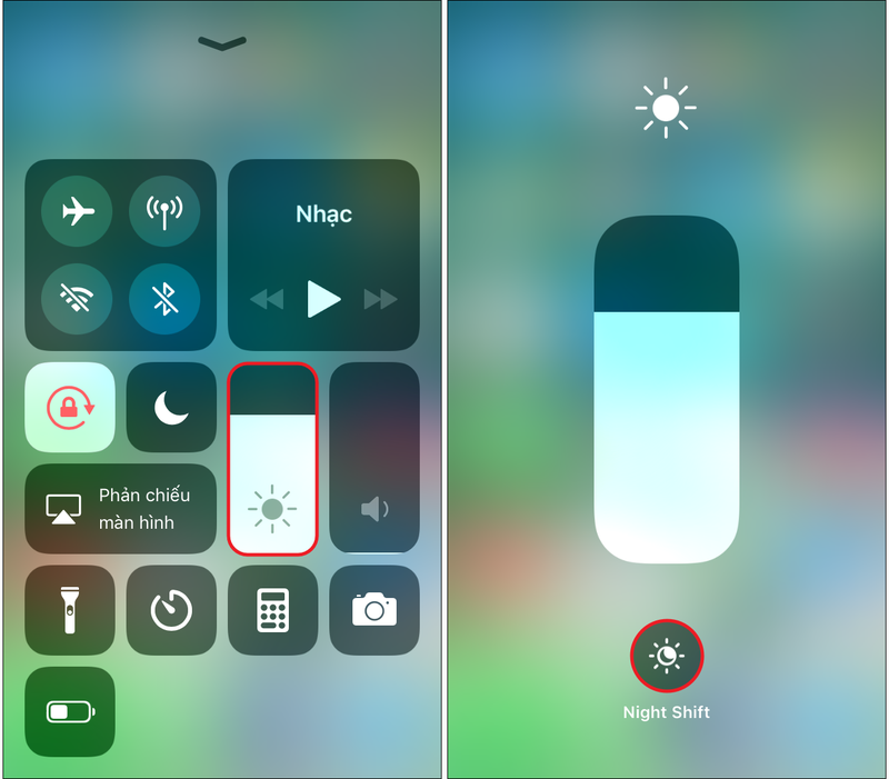 Để mở Night Shift, bạn nhấn và giữ biểu tưởng điều chỉnh sáng, nút bật/tắt Night Shift sẽ nằm ngay bên dưới thanh trượt điều chỉnh sáng.