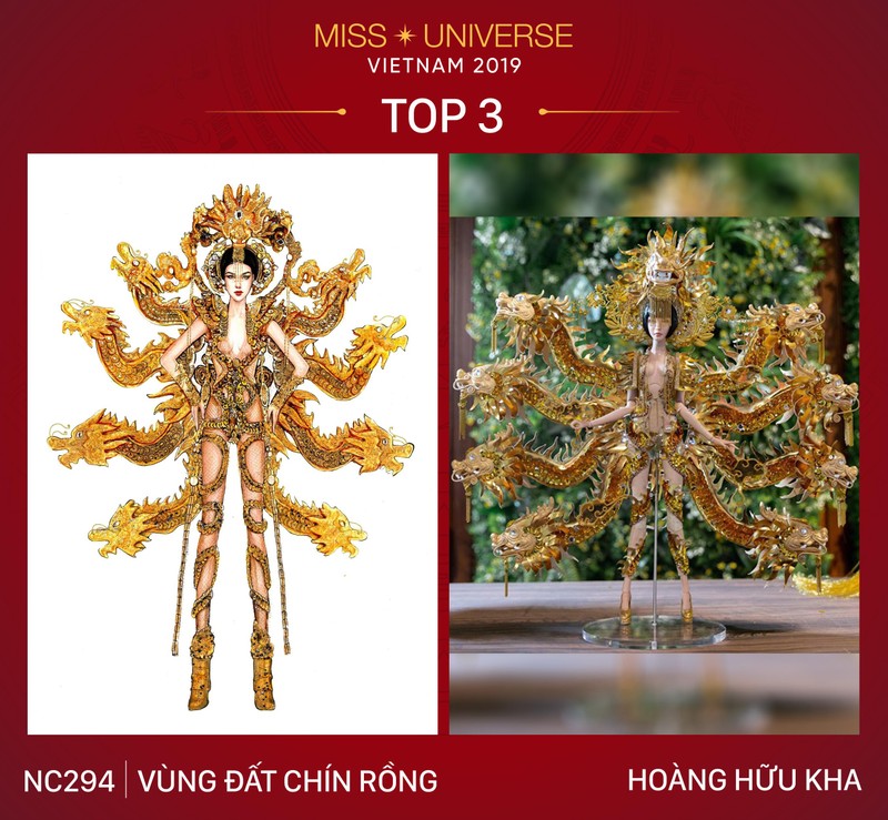 “Vùng đất chín rồng” của Hoàng Hữu Kha gây ấn tượng bởi sự hoành tráng của khung 9 con rồng phía sau. Cả bộ chỉ sử dụng duy nhất gam màu vàng kim. “Vùng đất chín rồng” thể hiện văn hóa truyền thống Việt Nam – thể hiện quyền bình đẳng nam nữ, nói lên nguồn gốc tên gọi Cửu Long Giang đã xuất hiện khi người dân nước Nam dưới thời Nguyễn khai hoang, mở mang vùng đất này.